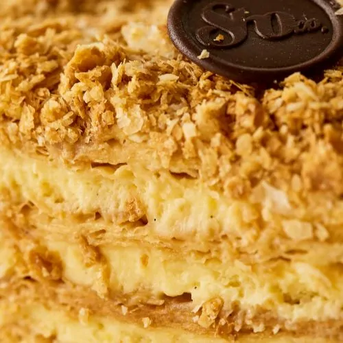 карамелізоване листкове тісто власного приготування, заварний крем з мадагаскарською ваніллю