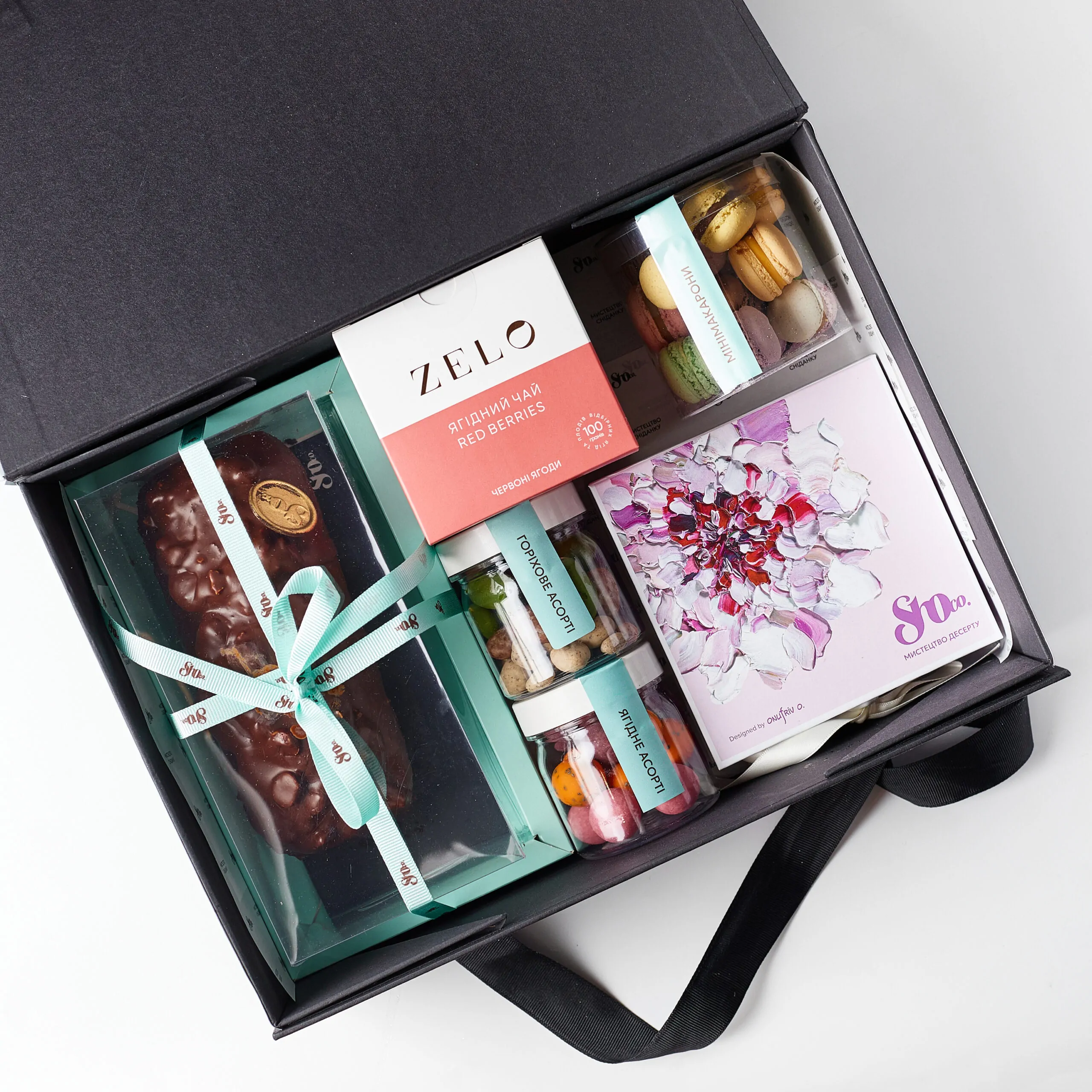 Кекс маковий, драже горіхове, драже фруктове, мінімакарони, сет 9 авторських цукерок, чай Zelo